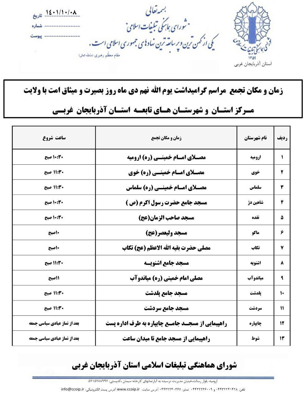 پنج شنبه 8 دی 1401 ساعت 19:00 زمان و مکان تجمع مراسم گرامیداشت یوم الله نهم دی ماه روز بصیرت و میثاق امت با ولایت مرکز استان و شهرستان های تابعه استان آذربایجان غربی روابط عمومی شورای هماهنگی تبلیغات اسلامی استان آذربایجان غربی