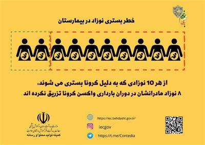 *خطر بستری نوزاد در بیمارستان* از هر 10 نوزادی که به دلیل کرونا بستری می شوند، 8 نوزاد، مادران شان در دوران بارداری واکسن کرونا تزریق نکرده اند. #واکسن_میزنم #با_ماسک_واکسن_برای_هم_بمانیم