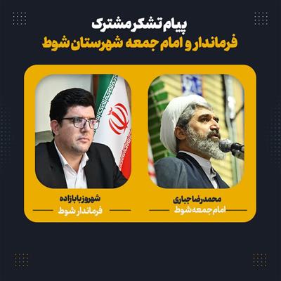 فرماندار و امام جمعه شهرستان شوط با صدور پیامی مشترک ضمن تشکر و قدردانی مردم همیشه در صحنه شهرستان شوط برای حضور حماسی در راهپیمایی یوم الله 22 بهمن، بر حضور پرشور در انتخابات آتی مجلس شورای اسلامی تاکید کردند. متن کامل این پیام به شرح زیر است: