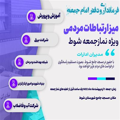 جهت پاسخگویی به مشکلات شهروندان و نماز گزاران در میز خدمت نماز جمعه حضور خواهند داشت .
