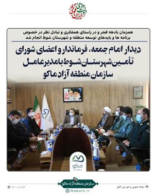 همزمان با ایام الله دهه فجر و در راستای همفکری و تبادل نظر در خصوص برنامه ها و بایدهای توسعه منطقه و شهرستان شوط صورت گرفت:امام جمعه، فرماندار و اعضای شورای تأمین شهرستان شوط با دکتر عبدالرحیمی مدیرعامل سازمام منطقه آزاد ماکودیدار و گفتگو نمودند