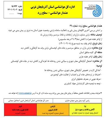 از اواخر وقت سه شنبه 8 آذر تا اواخر هفته جاری کلیه مناطق استان آذربایجان غربی بارش باران، برف و مه گرفتگی را تجربه خواهد کرد.