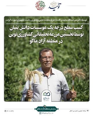 مزرعه تحقیقاتی حوزه کشاورزی نوین دکتر میرعبدالله محمدی اقدم پس از ارزیابی مرکز شرکت ها و موسسات دانش بنیان معاونت علمی و فناوری ریاست جمهوری ، به عنوان موسسه دانش بنیان درجه یک ارزیابی و تایید شد.