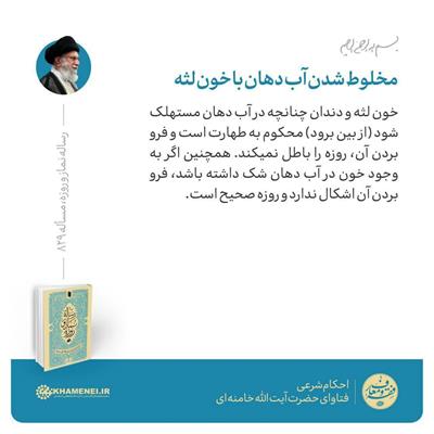 خون لثه و دندان چنانچه در آب دهان مستهلک شود (از بین برود) محکوم به طهارت است و فرو بردن آن، روزه را باطل نمیکند. همچنین اگر به وجود خون در آب دهان شک داشته باشد، فرو بردن آن اشکال ندارد و روزه صحیح است.