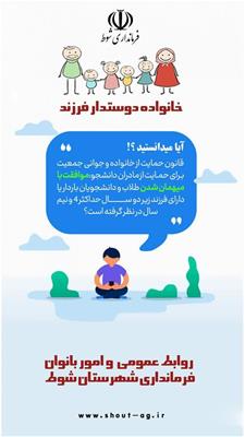 قانون حمایت از خانواده و جوانی جمعیت ، برای حمایت از مادران دانشجو : موافقت با مهمان شدن طلاب و دانشجویان باردار یا دارای فرزند زیر دو سال حداکثر 4 و نیم سال در نطر گرفته است.