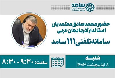 🔸هم استانى هاى عزیز می توانند براى ارتباط مستقیم با استاندار آذربایجان غربى روز شنبه 8 اردیبهشت ماه از ساعت 8:30 الی 9:30 صبح با شماره 111 (سامد) تماس و با ایشان گفتوگو نمایند.