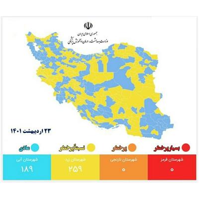 براساس رنگبندی کرونایی وزارت بهداشت تعداد شهرهای زرد از 319 به 259 شهر رسید و تعداد شهرهای آبی از 125 به 189 شهر افزایش یافت. هیچ شهری هم در وضعیت نارنجی و قرمز قرار ندارد.