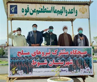 🔺برگزاری مراسم صبحگاه مشترک نیروهای نظامی و انتظامی شهرستان شوط 👈به گزارش روابط عمومی فرمانداری شهرستان شوط، 🔹در ششمین روز از هفته دفاع مقدس، مراسم صبحگاه م