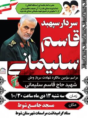 به گزارش روابط عمومی فرمانداری شوط :مراسم سومین سالگرد شهادت سرباز وطن سردار سپهبد قاسم سلیمانی در شهرستان شوط روز سه شنبه 13 دیماه ساعت 10/30 صبح در محل مسجد جامع شوط با حضور مسئولان و اقشار مختلف مردم برگزار خواهد شد.