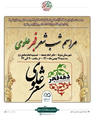 سومین شب شعر فجر با موضوع شب شعر فجر علوی در دفتر امام جمعه شهرستان شوط اجرا و این برنامه همه ساله ایام دهه فجر انقلاب اسلامی با همت نهادهای فرهنگی در دفتر امام جمعه شهرستان شوط برگزار می شود