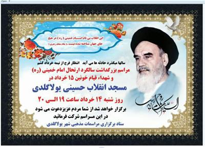 مراسم بزرگداشت سی و سومین سالگرد رحلت بنیانگذار کبیر انقلاب اسلامی امام خمینی (ره) و شهداء قیام پانزده خرداد روز شنبه 14 خرداد از ساعت 19 الی 20 در مسجد انقلاب حسینی شهر یولاگلدی برگزار خواهد شد.